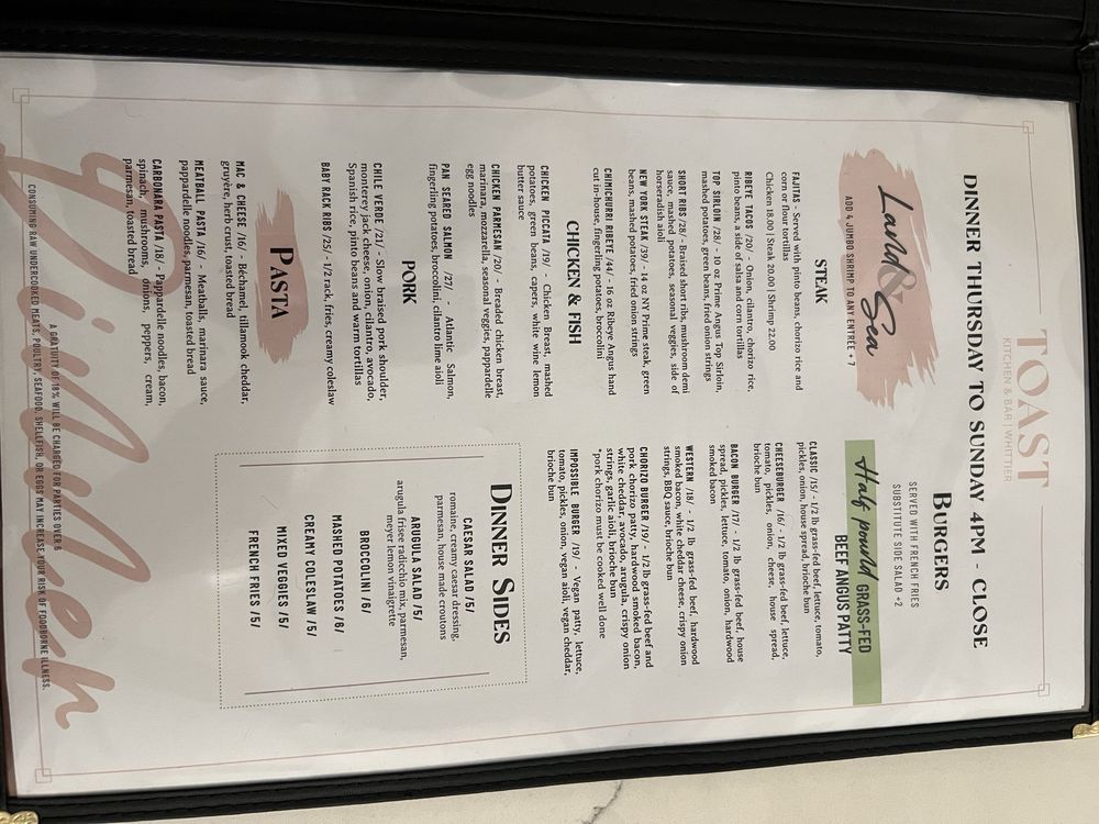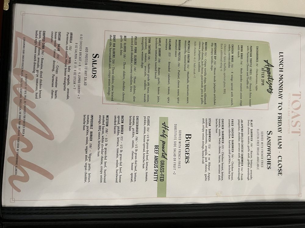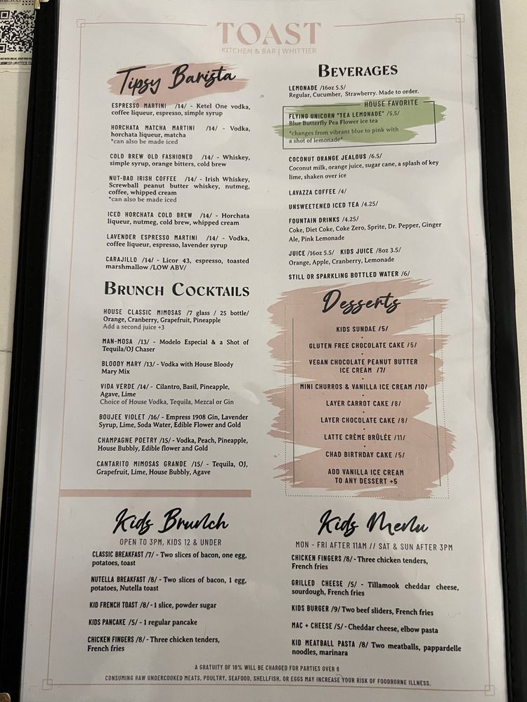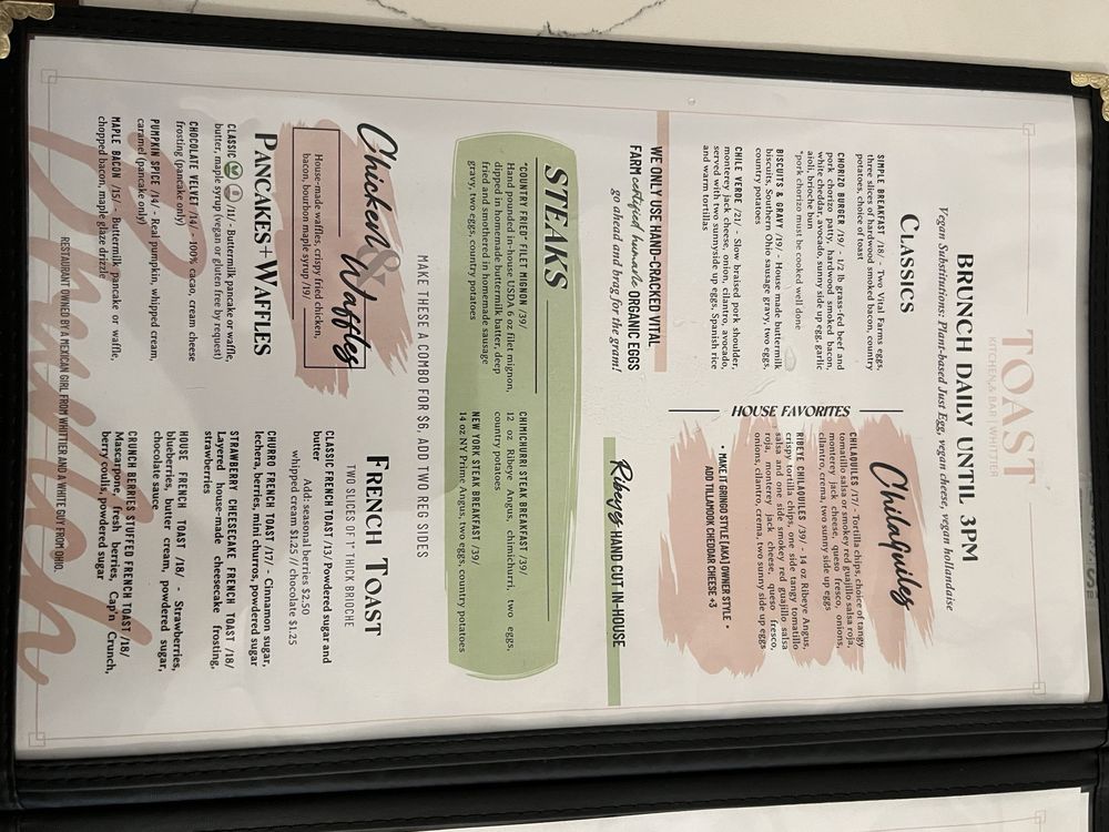 Toast Kitchen & Bar, a trendy and upscale restaurant in Whittier, CA, offers a diverse menu with various options like Keto, Vegan, and many vegetarian dishes. Known for its delicious chilaquiles and flavorful steaks, customers rave about the quality of food and friendly service. The atmosphere is lively, with spacious interiors, accommodating large groups easily. Popular dishes include ribeye chilaquiles and eggs Benedict, all cooked to perfection. The menu boasts artisanal cocktails and a great selection of brunch items. With features like wheelchair accessibility, outdoor seating, and private dining options, Toast Kitchen & Bar caters to a wide range of preferences. The reviews highlight the excellent food, friendly staff, and overall wonderful dining experience, making it a must-visit spot in the area.